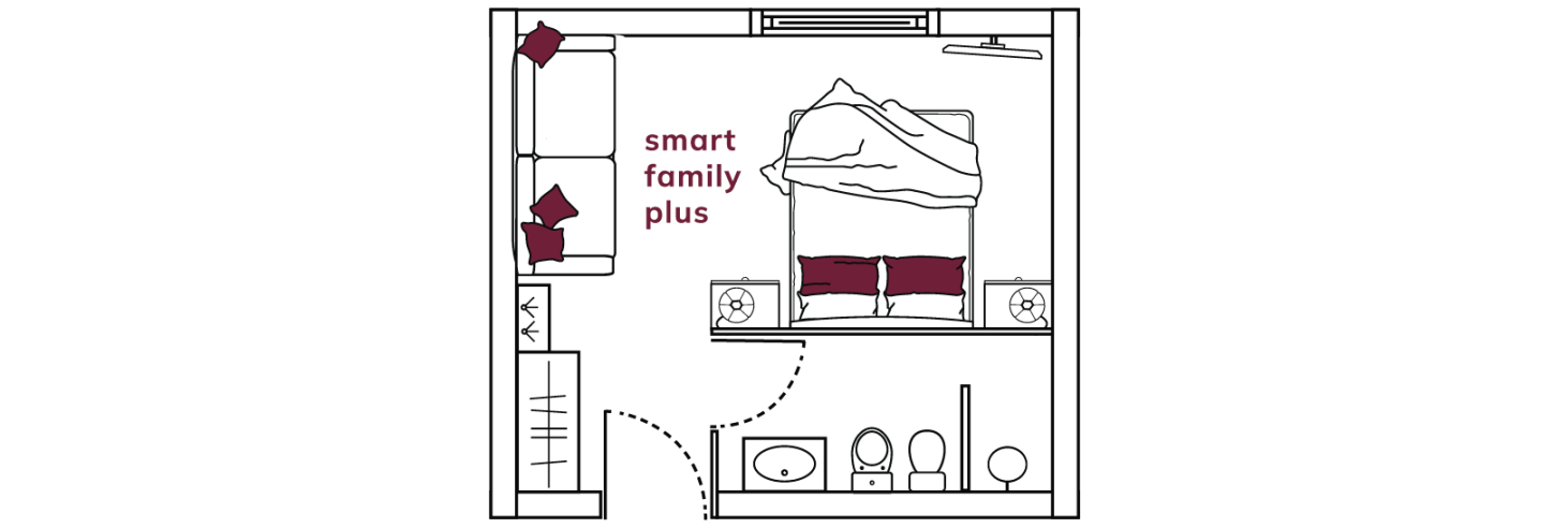 Almost all Smart Family Plus rooms are located on the 1st, 2nd, or 3rd floor and feature a terrace. Some rooms are located on the lower ground floor and ground floor. These rooms have windows.