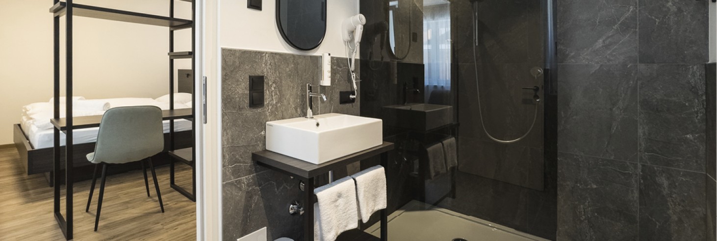 bagno con doccia (gel doccia corpo e capelli incluso), lavabo (con ripiano e specchio), asciugamani, asciugacapelli