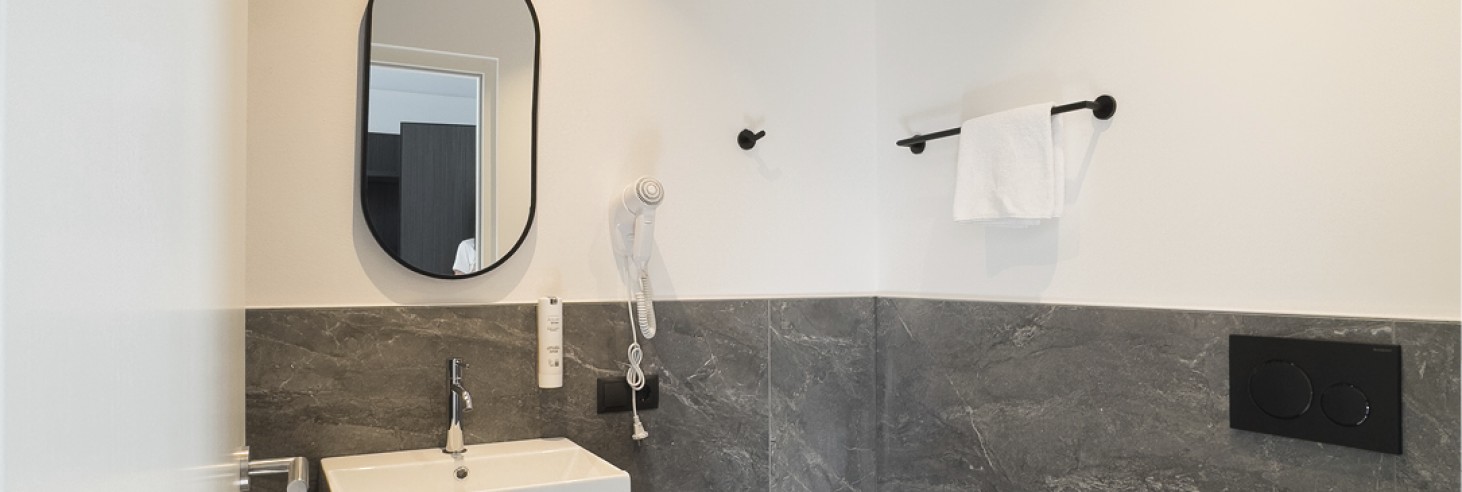 bagno con doccia (gel doccia corpo e capelli incluso), lavabo (con ripiano e specchio), asciugamani, asciugacapelli
